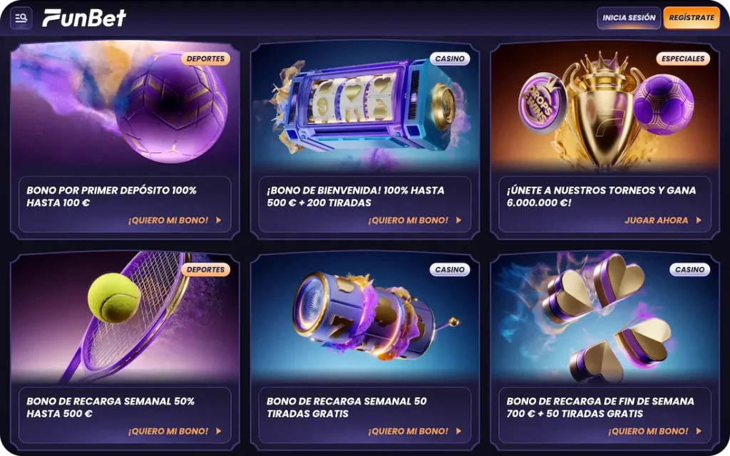 Funbet recompensa tanto a los jugadores de casino como a los apostadores deportivos con promociones lucrativas. La amplia variedad de bonos se dirige a todas las actividades de la plataforma. Puede obtener dinero de bono y giros gratis para aumentar su saldo inicial. Aquí tiene algunas de las mejores promociones en oferta: